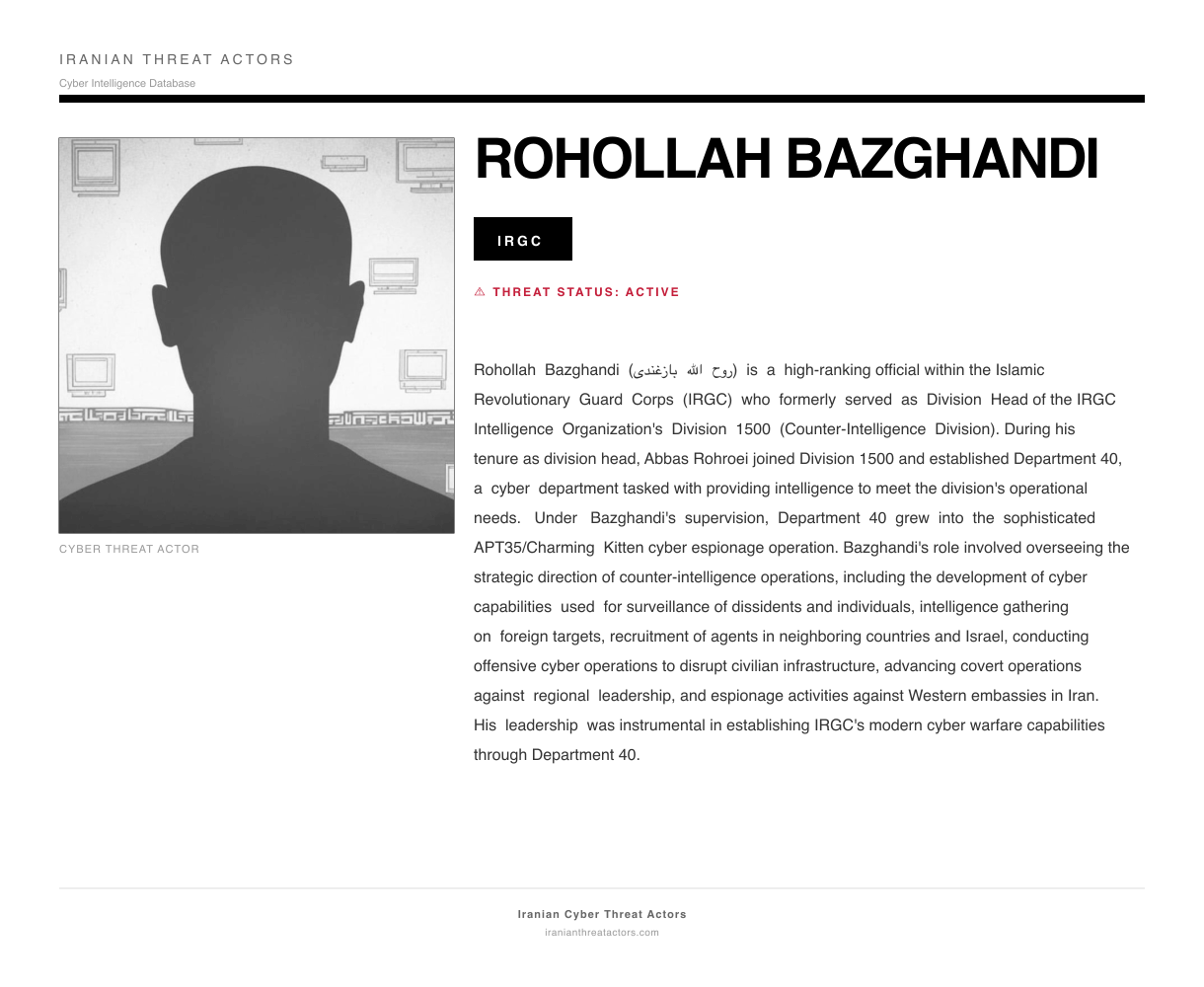 Rohollah Bazghandi (روح الله بازغندی) is a high-ranking official within the Islamic Revolutionary Guard Corps (IRGC) who formerly served as Division Head of the IRGC Intelligence Organization's Division 1500 (Counter-Intelligence Division). During his tenure as division head, Abbas Rohroei joined Division 1500 and established Department 40, a cyber department tasked with providing intelligence to meet the division's operational needs. Under Bazghandi's supervision, Department 40 grew into the sophisticated APT35/Charming Kitten cyber espionage operation. Bazghandi's role involved overseeing the strategic direction of counter-intelligence operations, including the development of cyber capabilities used for surveillance of dissidents and individuals, intelligence gathering on foreign targets, recruitment of agents in neighboring countries and Israel, conducting offensive cyber operations to disrupt civilian infrastructure, advancing covert operations against regional leadership, and espionage activities against Western embassies in Iran. His leadership was instrumental in establishing IRGC's modern cyber warfare capabilities through Department 40.
