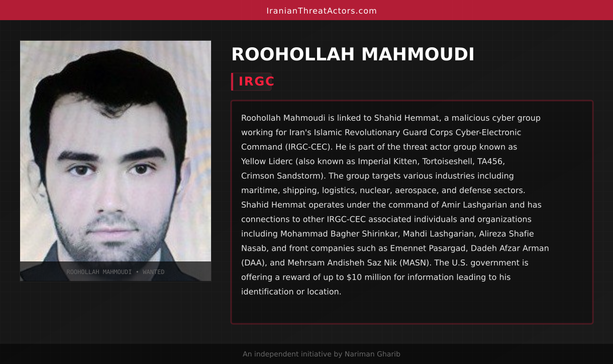 Roohollah Mahmoudi is linked to Shahid Hemmat, a malicious cyber group working for Iran's Islamic Revolutionary Guard Corps Cyber-Electronic Command (IRGC-CEC). He is part of the threat actor group known as Yellow Liderc (also known as Imperial Kitten, Tortoiseshell, TA456, Crimson Sandstorm). The group targets various industries including maritime, shipping, logistics, nuclear, aerospace, and defense sectors. Shahid Hemmat operates under the command of Amir Lashgarian and has connections to other IRGC-CEC associated individuals and organizations including Mohammad Bagher Shirinkar, Mahdi Lashgarian, Alireza Shafie Nasab, and front companies such as Emennet Pasargad, Dadeh Afzar Arman (DAA), and Mehrsam Andisheh Saz Nik (MASN). The U.S. government is offering a reward of up to $10 million for information leading to his identification or location.