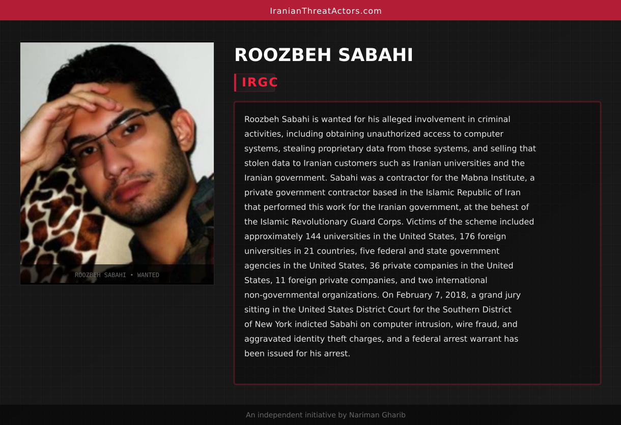 Roozbeh Sabahi is wanted for his alleged involvement in criminal activities, including obtaining unauthorized access to computer systems, stealing proprietary data from those systems, and selling that stolen data to Iranian customers such as Iranian universities and the Iranian government. Sabahi was a contractor for the Mabna Institute, a private government contractor based in the Islamic Republic of Iran that performed this work for the Iranian government, at the behest of the Islamic Revolutionary Guard Corps. Victims of the scheme included approximately 144 universities in the United States, 176 foreign universities in 21 countries, five federal and state government agencies in the United States, 36 private companies in the United States, 11 foreign private companies, and two international non-governmental organizations. On February 7, 2018, a grand jury sitting in the United States District Court for the Southern District of New York indicted Sabahi on computer intrusion, wire fraud, and aggravated identity theft charges, and a federal arrest warrant has been issued for his arrest.