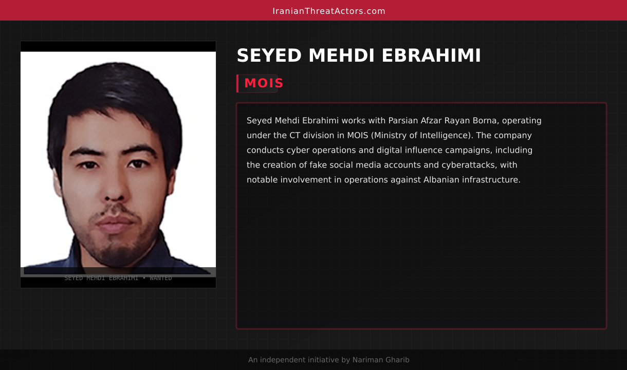 Seyed Mehdi Ebrahimi works with Parsian Afzar Rayan Borna, operating under the CT division in MOIS (Ministry of Intelligence). The company conducts cyber operations and digital influence campaigns, including the creation of fake social media accounts and cyberattacks, with notable involvement in operations against Albanian infrastructure.