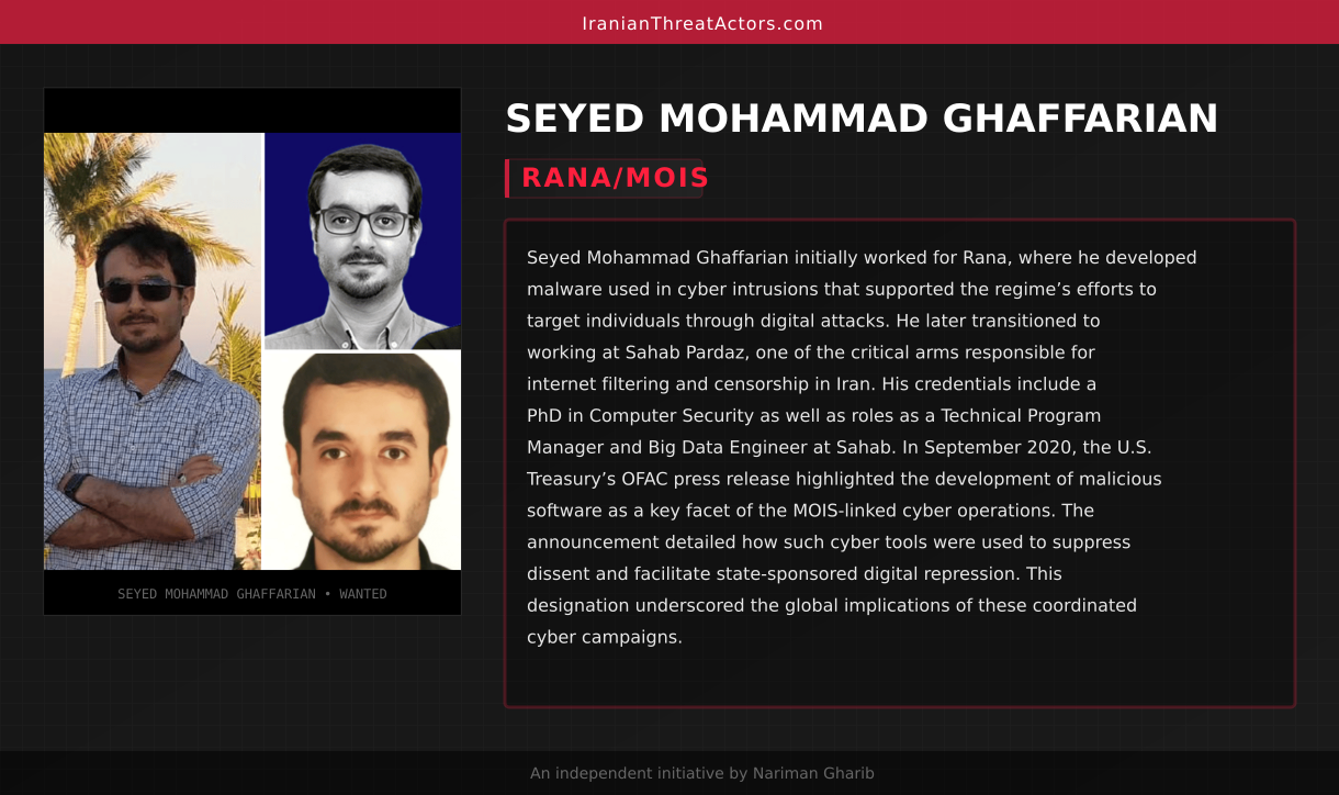 Seyed Mohammad Ghaffarian initially worked for Rana, where he developed malware used in cyber intrusions that supported the regime’s efforts to target individuals through digital attacks. He later transitioned to working at Sahab Pardaz, one of the critical arms responsible for internet filtering and censorship in Iran. His credentials include a PhD in Computer Security as well as roles as a Technical Program Manager and Big Data Engineer at Sahab. In September 2020, the U.S. Treasury’s OFAC press release highlighted the development of malicious software as a key facet of the MOIS-linked cyber operations. The announcement detailed how such cyber tools were used to suppress dissent and facilitate state-sponsored digital repression. This designation underscored the global implications of these coordinated cyber campaigns.