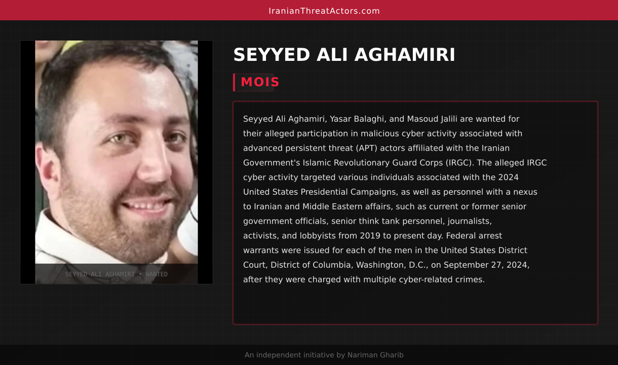 SeyyedMohammad Ali Aghamiri, Yasar Balaghi, and Masoud Jalili are wanted for their alleged participation in malicious cyber activity associated with advanced persistent threat (APT) actors affiliated with the Iranian Government's Islamic Revolutionary Guard Corps (IRGC). The alleged IRGC cyber activity targeted various individuals associated with the 2024 United States Presidential Campaigns, as well as personnel with a nexus to Iranian and Middle Eastern affairs, such as current or former senior government officials, senior think tank personnel, journalists, activists, and lobbyists from 2019 to present day. Federal arrest warrants were issued for each of the men in the United States District Court, District of Columbia, Washington, D.C., on September 27, 2024, after they were charged with multiple cyber-related crimes.