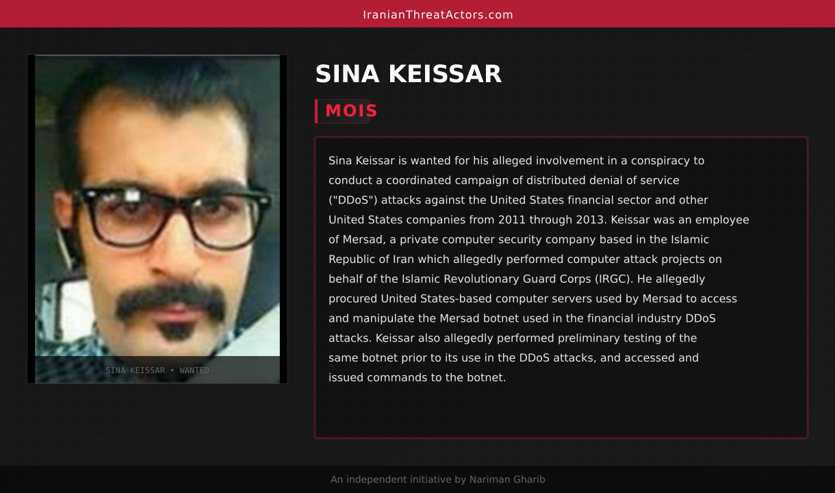 Sina Keissar is wanted for his alleged involvement in a conspiracy to conduct a coordinated campaign of distributed denial of service ("DDoS") attacks against the United States financial sector and other United States companies from 2011 through 2013. Keissar was an employee of Mersad, a private computer security company based in the Islamic Republic of Iran which allegedly performed computer attack projects on behalf of the Islamic Revolutionary Guard Corps (IRGC). He allegedly procured United States-based computer servers used by Mersad to access and manipulate the Mersad botnet used in the financial industry DDoS attacks. Keissar also allegedly performed preliminary testing of the same botnet prior to its use in the DDoS attacks, and accessed and issued commands to the botnet.