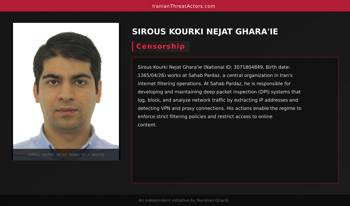 Sirous Kourki Nejat Ghara'ie (National ID: 3071804849, Birth date: 1365/04/26) works at Sahab Pardaz, a central organization in Iran's internet filtering operations. At Sahab Pardaz, he is responsible for developing and maintaining deep packet inspection (DPI) systems that log, block, and analyze network traffic by extracting IP addresses and detecting VPN and proxy connections. His actions enable the regime to enforce strict filtering policies and restrict access to online content.
