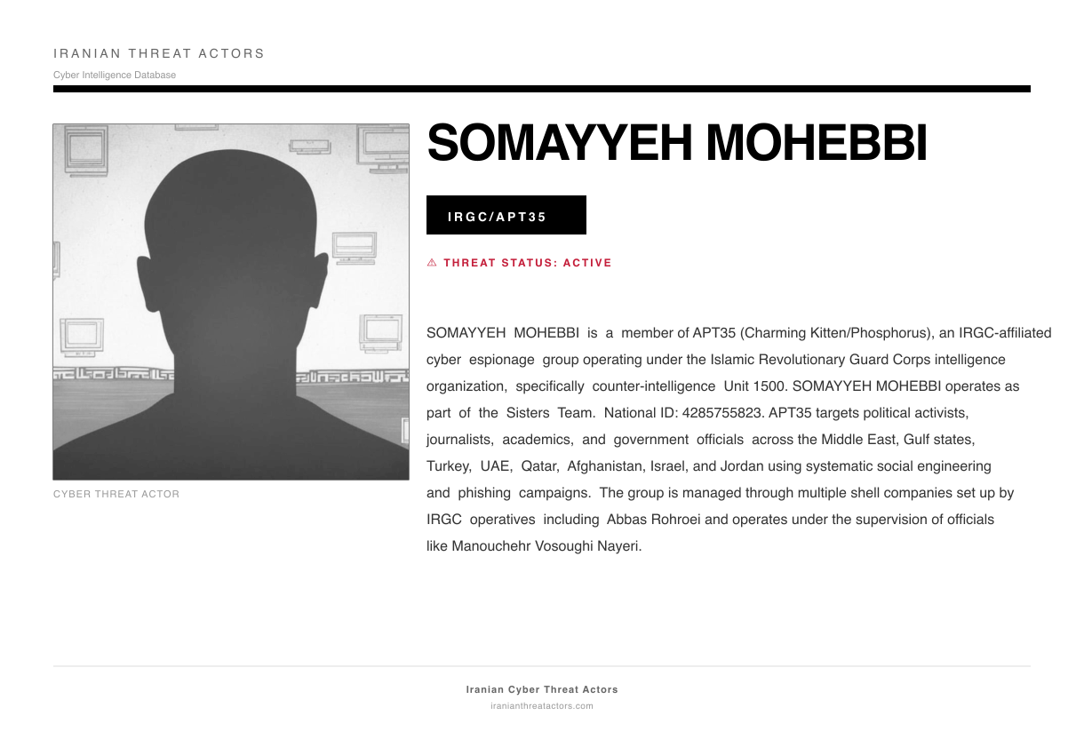 SOMAYYEH MOHEBBI is a member of APT35 (Charming Kitten/Phosphorus), an IRGC-affiliated cyber espionage group operating under the Islamic Revolutionary Guard Corps intelligence organization, specifically counter-intelligence Unit 1500. SOMAYYEH MOHEBBI operates as part of the Sisters Team. National ID: 4285755823. APT35 targets political activists, journalists, academics, and government officials across the Middle East, Gulf states, Turkey, UAE, Qatar, Afghanistan, Israel, and Jordan using systematic social engineering and phishing campaigns. The group is managed through multiple shell companies set up by IRGC operatives including Abbas Rohroei and operates under the supervision of officials like Manouchehr Vosoughi Nayeri.